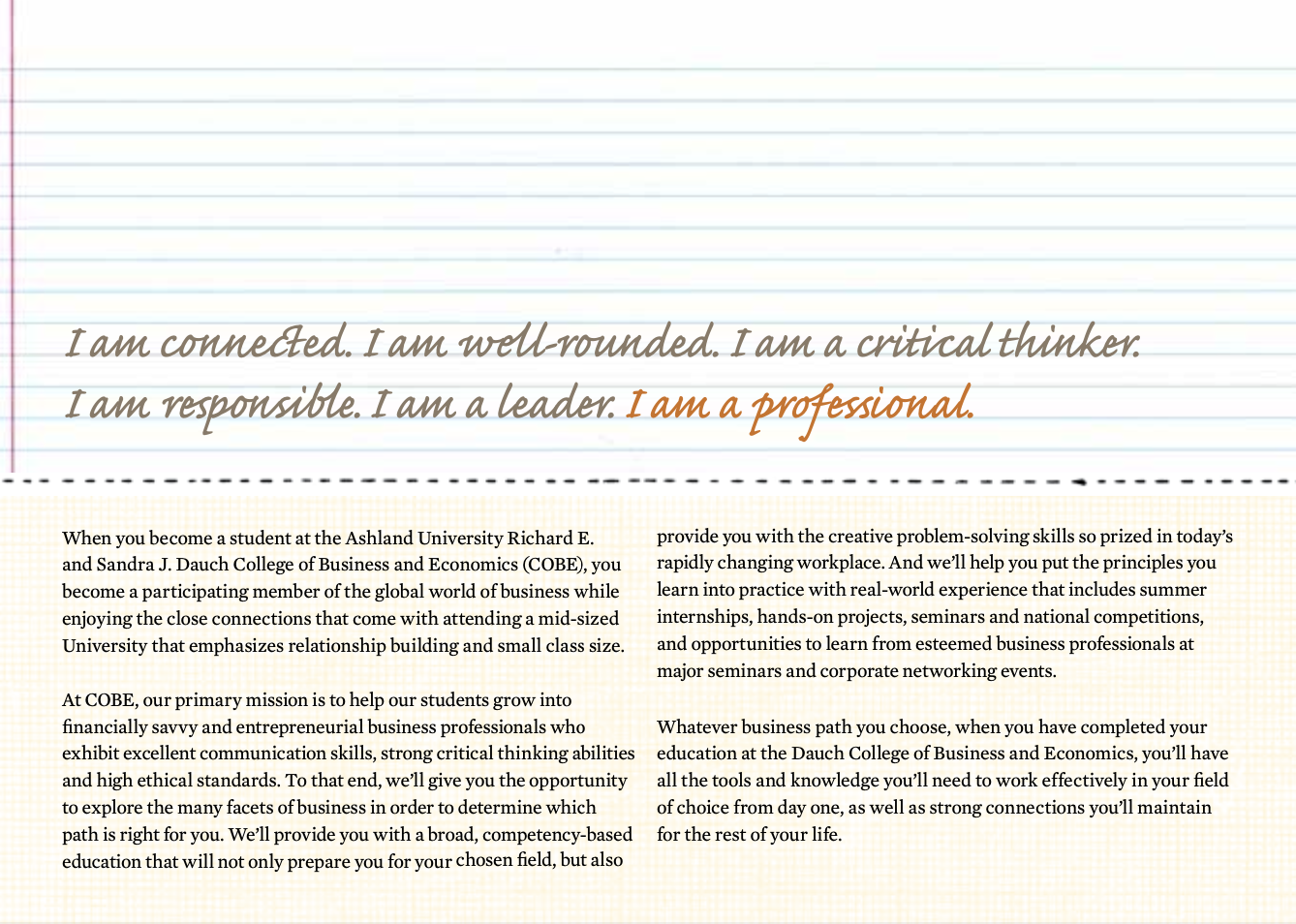 Ashland University wanted to showcase each of their colleges in a series of viewbooks. We worked with faculty, administration and students to learn what made each college unique and then told their stories from the perspective of the students. We capped the series with a “College by the Numbers” booklet that guided high school students through the steps they needed to take to pay for college.